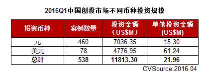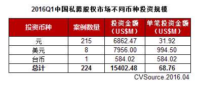 表11 2016Q1中国私募股权市场不同币种的投资规模