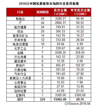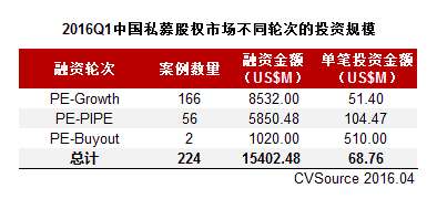 2016年1季度中国PE投资市场披露的案例数为224起,投资总金额为154.02亿美元,从近几个季度的PE市场的数据来看,本季度的PE投资是有所下降的。VC市场在本季度披露的发生在中国区的案例数目为538起,投资金额规模为118.13亿美元。本季度VC市场继续大放异彩,投资势头强劲,表现不俗,披露的平均单笔投资金额规模更是创下了近1年来的峰值,投资状态稳中有升。