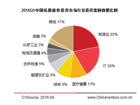 图7 2016Q1中国私募股权投资市场行业投资案例数量比例