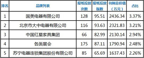 梅花网发布了2012年4月份的北京,上海,广州三大城市的报纸广告主TOP50。数据显示:2012年4月1日 – 2012年4月30日期间,在北京市报纸广告主中,国美电器有限公司排在第一。