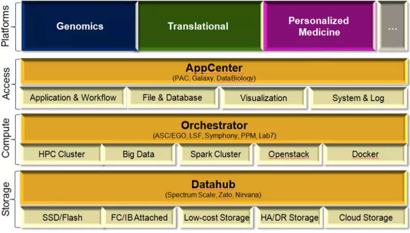如图中所示,存储基础技术(固态硬盘、闪存、普通硬盘、云),计算(高性能计算、大数据、Spark、OpenStack、Docker)和用户访问的信息技术(应用工作流、文件协议、数据库查询、可视化、监控)由三个企业功能数据集线器、负载编排器和应用中心统一管理。