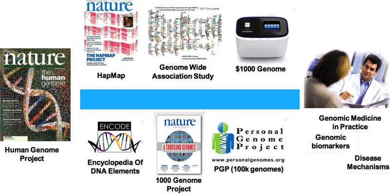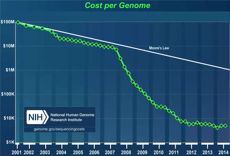 人类基因组计划是首个用来确定人类基因组序列的科研项目。该项目历时13年,耗费近30亿美元,于2003年完成,是目前为止最大的生物学合作项目。从那时起,一系列的技术进步在DNA测序和大规模基因组数据分析中展露头脚,对单个人类全基因组进行测序的时间和成本随之急剧下降,下降速度甚至超过了摩尔定律。