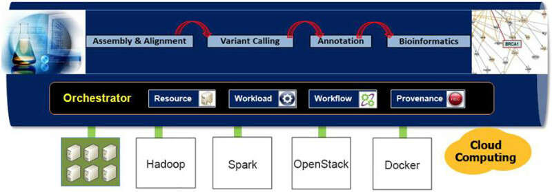 基于工作流逻辑和应用需求(如架构、CPU、内存、I/O),通过映射和分配负载到有弹性的异构资源(如HPC、Hadoop、Spark、OpenStack/Docker、Cloud),编排器在不同的计算基础设施和高速增长的基因组计算数组间定义出抽象层。