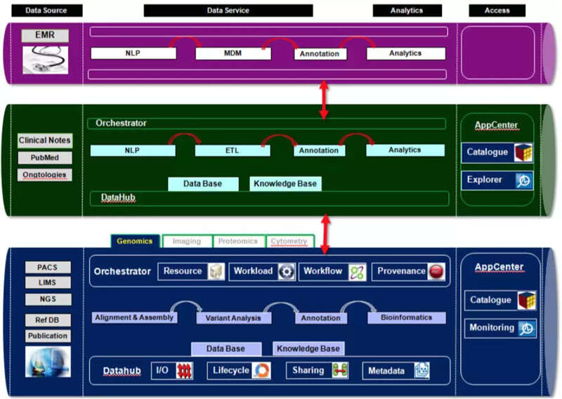图中蓝色表示基因组研究平台、绿色表示转化平台、紫色表示个性化医疗平台。这三个平台共享企业级功能:负责数据管理的集线器、负载负载管理的编排器和负责访问管理的应用中心。