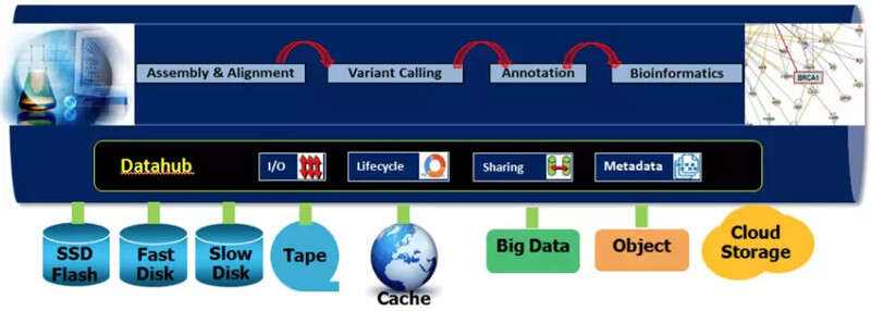 为了解决基因组数据管理中遇到的问题,构建一个可伸缩、可扩展层提供数据和元数据给负载,这样的企业级功能可被命名为数据集线器。它可以存储、移动、共享和索引海量基因组的原始和处理后数据。它还管理着从固态硬盘或闪存到磁盘、磁带、以及云的底层异构存储结构。