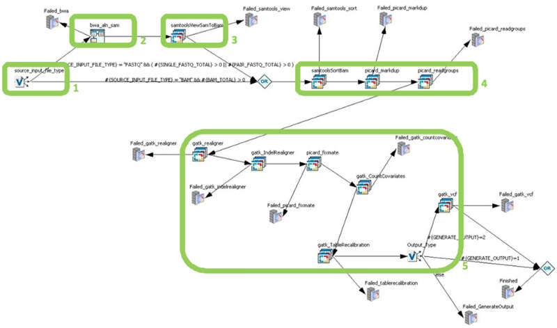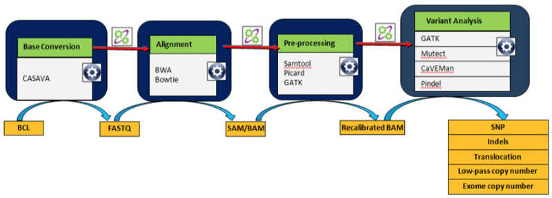 基因组工作流结合一些应用程序和工具,把原始序列数据(BCL)处理为变型(VCF)数据。每个框表示一个工作流功能模块,它由映射到功能的基因组应用程序组成,如基因组碱基转换、序列比对、前处理、以及变型提取和分析。这些模块自身可作为独立工作流被集成,并按照逻辑和条件关系被连接到一个更大的工作流中。