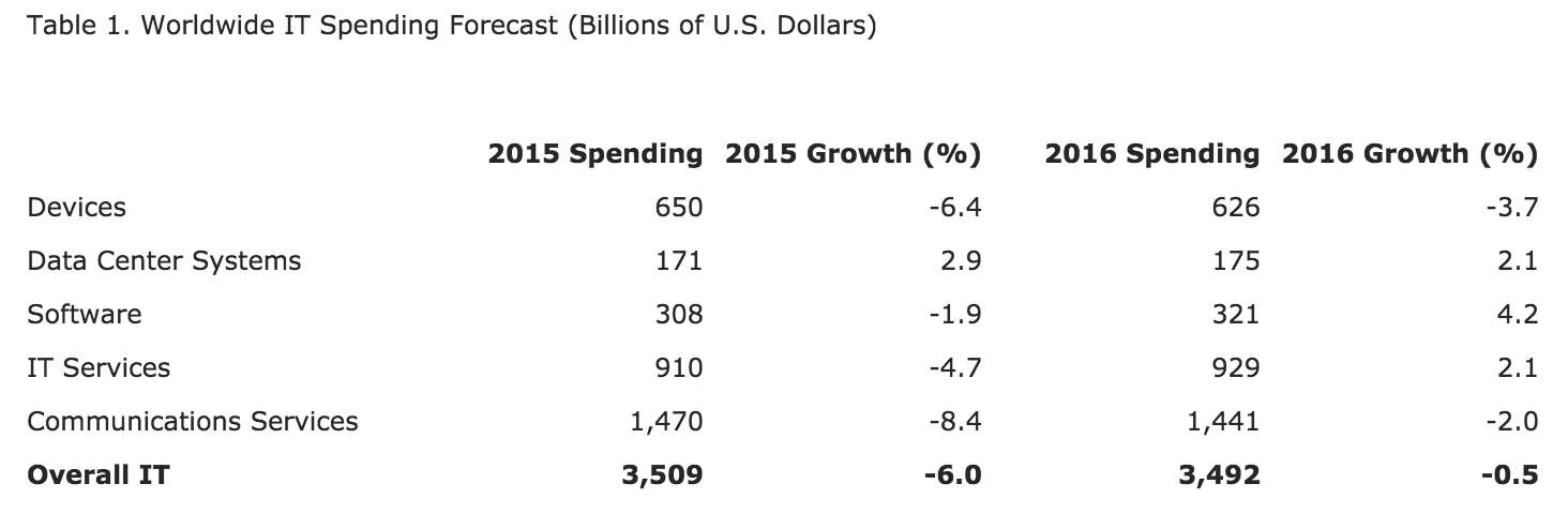 Gartner预计,按不变汇率计算,今年全球IT支出将增长1.6%,低于去年的2.4%。