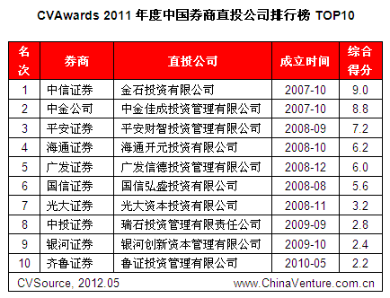 基于以上数据,并结合旗下数据库产品CVSource掌握的券商直投IPO退出情况,ChinaVenture投中集团根据券商直投公司注册资本金(管理基金)规模、投资案例数量、投资规模、退出案例数量、账面回报规模、回报率等6项指标,对券商直投公司进行评比,推出“CVAwards 2011年度中国券商直投公司排行榜”,位列前十位的分别是金石投资、中金佳成、平安财智、海通开元、广发信德、国信弘盛、光大资本、瑞石投资、银河创新资本和鲁证投资。
