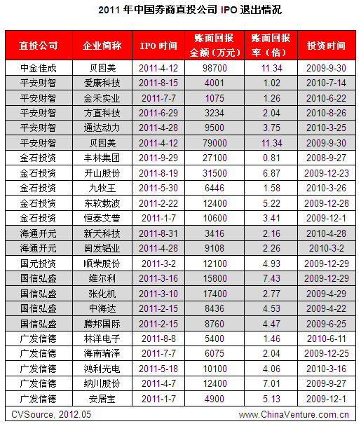 退出方面,2011年,券商直投已迎来其退出高峰,全年共有22家券商直投支持的公司实现IPO,涉及账面退出23起(平安财智、中金佳成两家公司在贝因美IPO中实现退出),超过此前2009-2010年合计19起IPO退出数量(2007-2008年无退出案例)。进入2012年至今,其IPO退出的活跃状态依然延续,截至4月底,已披露退出案例12起。而根据ChinaVenture投中集团对目前证监会公布排队上市企业VC/PE背景的统计,共有24家有券商直投支持的公司在排队当中,预计2012年全年券商直投公司IPO退出总规模依然保持较高水平。