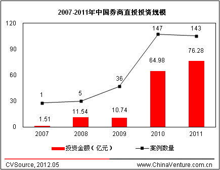 《ChinaVenture2011年中国券商直接投资业务统计分析报告》显示,在35家券商直投公司中,有25家于2011年进行了投资,共披露投资案例143起,投资总额约76.28亿元。其中,金石投资、海通开元、广发信德表现活跃,投资案例均超过10起,投资金额分别为23.67亿元、6.77亿元和4.98亿元。瑞石投资、光大资本、国信弘盛、东吴创投、鲁证投资、银河创新资本等公司披露投资案例均达5起以上。案例数量为5起及5起以下的公司为15家,未披露投资案例的券商直投公司有10家。值得关注的是,中金佳成旗下直投基金中金佳泰于2011年完成首轮募资,并已开展投资,2011年披露投资案例5起,投资总额达10亿元以上。