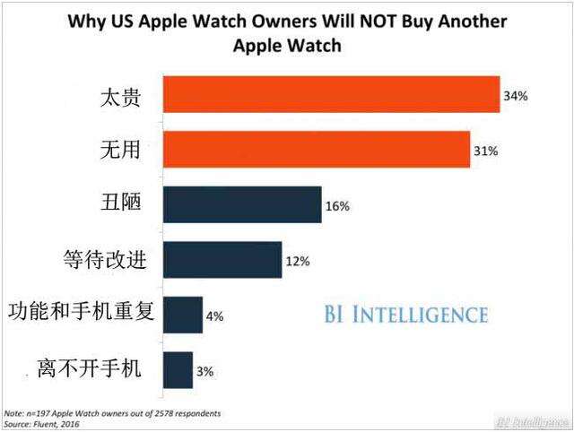 此外,有34%的人表示他们不会再购买Apple Watch,因为它的价格太贵;还有31%的人表示不再购买Apple Watch的原因是它没有多大用处。