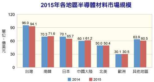 国际半导体产业协会(SEMI)发表最新统计数据指出,2015年全球半导体材料市场产值为434亿美元,其中,台湾为94.1亿美元,连续6年蝉联最大市场;而南韩、中国大陆、北美与欧洲都有微幅成长,日本则出现6.28%的衰退幅度。