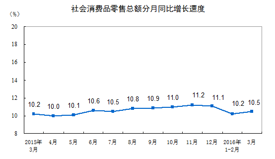 2016年3月份,社会消费品零售总额25114亿元,同比名义增长10.5%(扣除价格因素实际增长9.7%,以下除特殊说明外均为名义增长)。其中,限额以上单位消费品零售额11717亿元,增长8.6%。