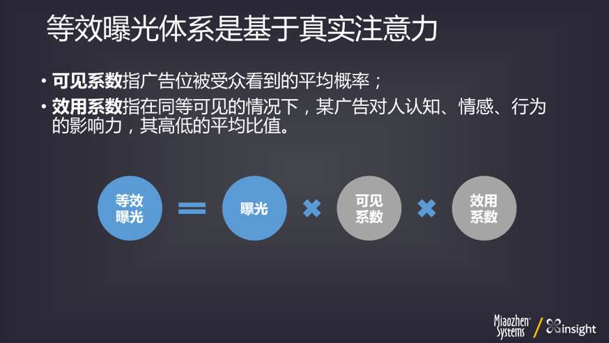 于是,为了统一标准,数字新思和中国广告协会共同推出等效曝光的标准,解决广告主如何跨平台、跨形态地去做优化广告投放。首先每一种形态的曝光都是重要的,其次是可见性,被受众看到的平均概率。最后是效用的系数,指的是对于受众的记忆或者购买的影响力如何。把这三件事情放在一起才能做到等效的体系,才能把跨屏、跨形态曝光体系结合在一起。