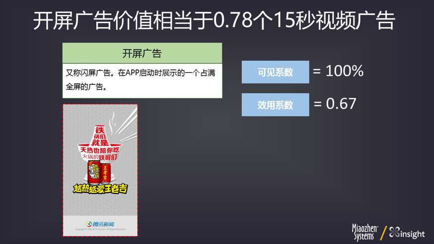 去年我们研究了一个APP的开屏广告对人的影响,采集了7、8个15秒视频的广告,有这些可见系数和效用系数,能帮助我们做整合的分析。通过结合行为的测量、情感的测量,以及技术的测量,把每一个页面、形态都测量出来,从而真正计算出广告的位置、广告的创意,对人的影响力是什么样的,最终受众的行为是什么样的。