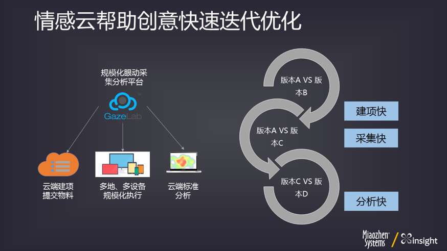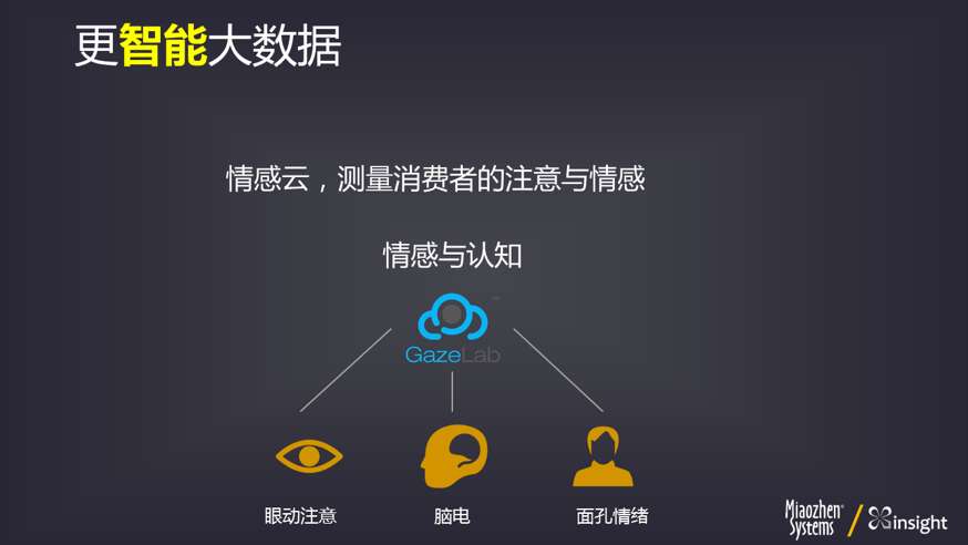 大数据不仅仅分析消费者看什么东西,浏览什么网页,营销过程中还有很大一部分是情感。就像前段时间IBM推出认知云的概念,都是关于复杂人类心理状态的把握。同样数字新思也是往神经科学方面努力,利用“Gazelab情感云”了解一个人注意什么,思考什么,面孔上所表达的是什么,这些会成为很重要的数据源。只有结合情感和行为的数据才能组合成更大更智能的数据。