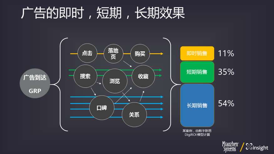 从广告内容的曝光到消费者的购买,有无数的路径去实现购买的可能性。任何一个广告到达,最终目的包括实现及时的销售转换,或者短期的销售增长,也可能是实现品牌的增长。数字新思研究过很多的案例发现,广告活动对于及时销售转换的贡献只占销售的11%,对于短期销售、一周类销售的增长贡献为35%,而对于长期销售能达到54%,这是非常有趣的数字。数字营销一定不要被数字绑死,我们不能只是看到转化率。如果只盯着转化率,算下来会发现投放根本不值得,但其实是因为你拿及时的效果来做比较而已。