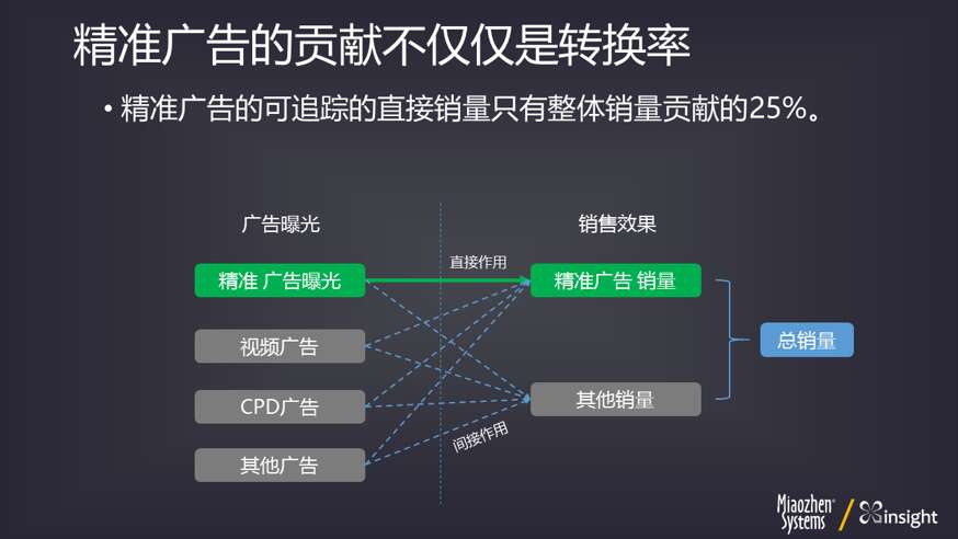 数字新思做过这样一个案例,比较精准广告曝光和各种视频的曝光,最终产生消费者的贡献是什么?在这个电商案例里,他有不定时广告,也有站内站外的广告、首页大图的广告,每一个广告的销量都是有贡献的,除了追踪到精准广告的销量贡献,结果我们发现还有三倍的销量发生在不可追踪的部分。因为消费者购买的时候会点击广告,可是常常不会在点广告之后马上购买,可能在下一次搜索寻找的时候才去购买广告的产品,这就是间接效应。如果用同源数据就能把所有的销售反馈找到,也就能帮助我们更好地找到广告该投在哪里。