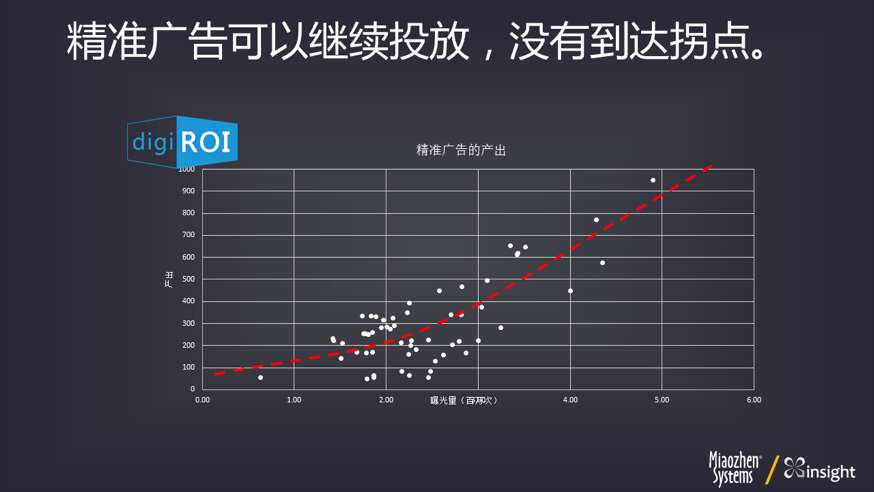 当广告主在做精准广告投放时常常会遇到一个问题,到底是投一百万就够了,还是投两百万更好?到什么样的情况下是有效的?下图是我们做过的某电商案例,从图中反映的是投资和收益的情况,可以看出ROI(投资与回报)的增长速率并未减弱,对品牌主的指导建议是应该继续增大投入。当增长速率开始减弱,则应该适当控制投入,以满足ROI最大化。