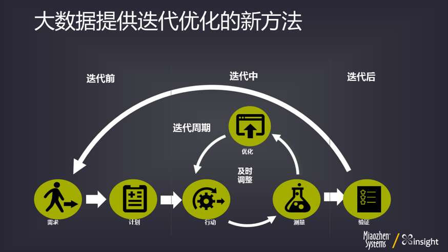 与传统营销概念的不同在于,传统营销是大主意驱动,所有的数据反馈很慢,至少要两个月。而拥有大数据之后,营销中每一次行为都能快速反应。例如,在互联网里AB测试是非常好的测试方法论,因为根本不需要讨论A好还是B好,用一天的时间大数据告诉我们A比B就好1%,再通过优化比较下一轮,然后再优化1%。这就是所谓的迭代优化。