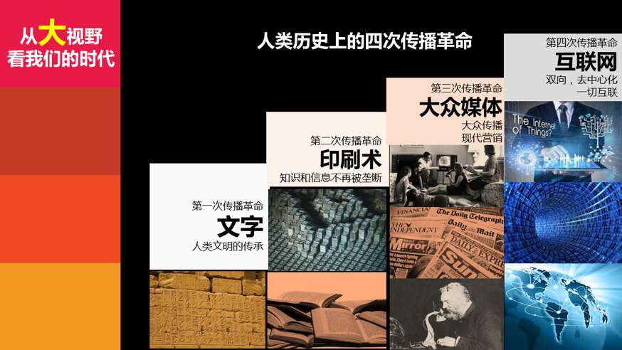 从时代角度去思考,人类历史上四次传播革命:印刷数的出现、文字的出现、大众媒体出现到互联网的出现。我们以前所用的传播理论、电视传播理论、所有品牌建设理论都是在第三次传播革命中产生的,都是在大量的电视、报刊杂志中产生的。互联网将给我们带来什么,是所有营销人需要探索的问题。