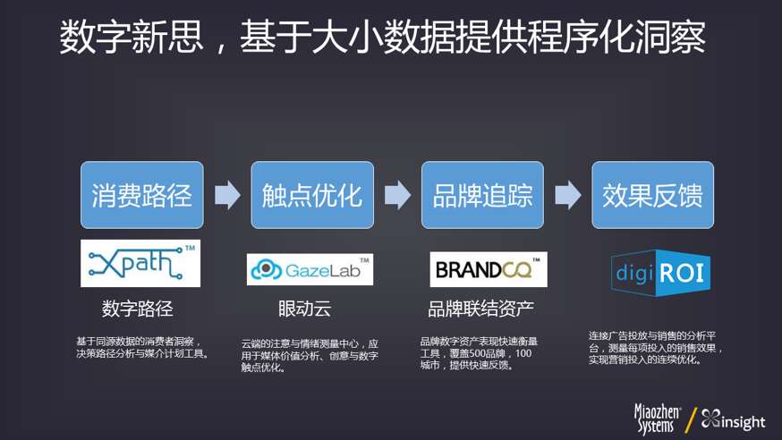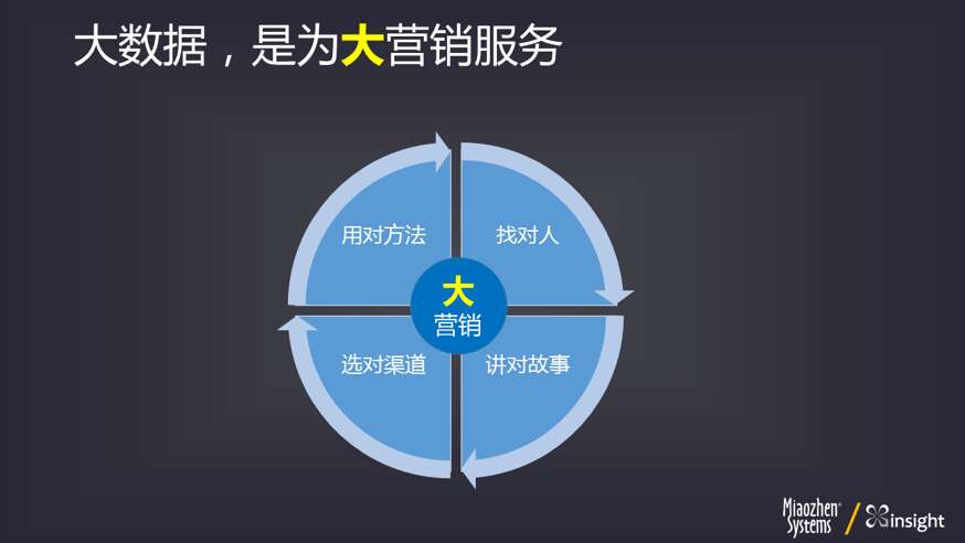 数字新思xinsight.cn希望大数据不只是指导数字营销找对人,给人画标签,广告主投上去,大数据是要为大营销服务,而不仅仅是为数字营销服务。宝洁提到很重要一点,他们的大数据在为产品服务,在为体验服务,就是同样的道理。“找对人”是营销很重要的一件事情。传递给客户什么样的故事,要用什么样的创意,用什么样的渠道,最终用什么样的方法,这些都是大营销里需要考虑的问题。