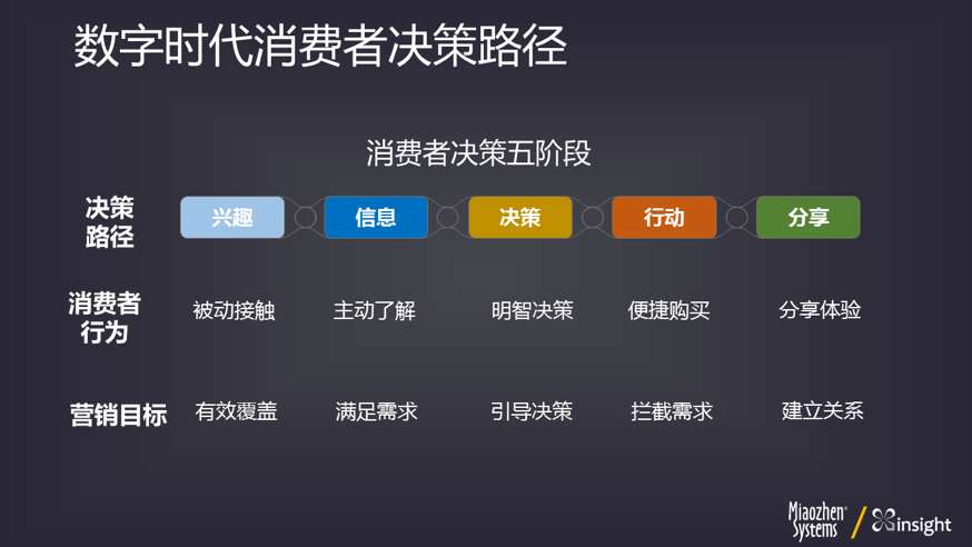 决策路径,消费者在整个过程中是很大的决策路径,既有被动传播,也有主动了解的部分,还有决策部分、分享的部分。在精准营销时,大多在主动性和被动性媒体上都有结合,包括电视媒体效果怎么样,户外媒体效果怎么样,都是我们要研究的对象。