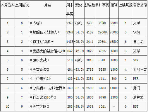 上周末大规模开画的影片中仅环球发行的喜剧《老板》稍具竞争力,影片首周末收入2348万美元,以极其微弱的优势击败霸榜两周的《蝙蝠侠大战超人》,登上新一周北美周末票房榜首。