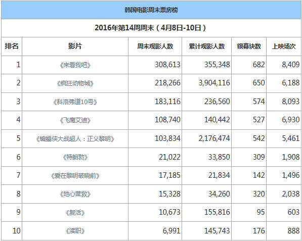 2016年第14周周末(4月8日-10日),韩国电影票房整体依旧惨淡,前十名中只有一部韩片。在没有绝对竞争对手的情况下,《来看我吧》作为韩片代表登上了票房榜冠军,领跑新片。相比前一周总观影人次100万人,上周末观影人数为106万人,平均上座率继续下跌,仅为13.2%。