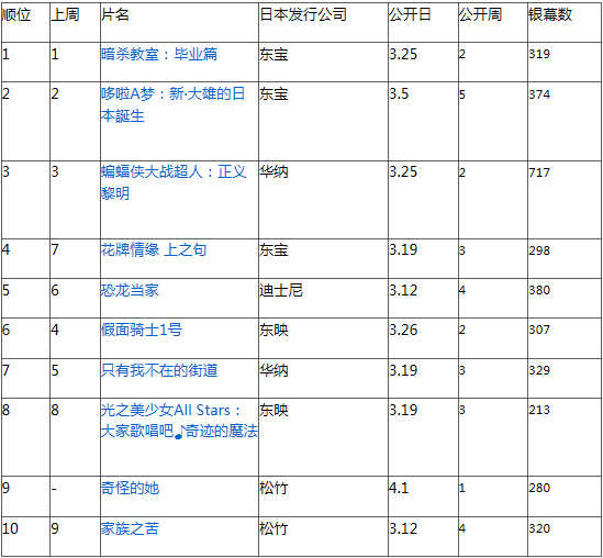 第三位《蝙蝠侠大战超人:正义黎明》,上周末动员观众13万6402人次,票房收入2亿2303万8900日元。影片累计动员观众70万人次,累计票房收入突破10亿日元。
