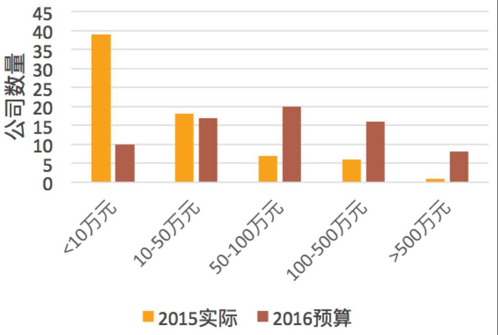从创业公司2015年市场领域的花费及2016年的预算可以看到,2015年绝大部分公司在这一领域的花费低于50万元,但2016年大部分公司的市场品牌预算都超过了100万元,甚至还有多家公司的预算在500万元以上。虽然这个数字对于成熟企业可能只是一部广告片的预算,但对于A轮及更早期的创业公司来说,这意味着品牌的打造已经成为首要任务。