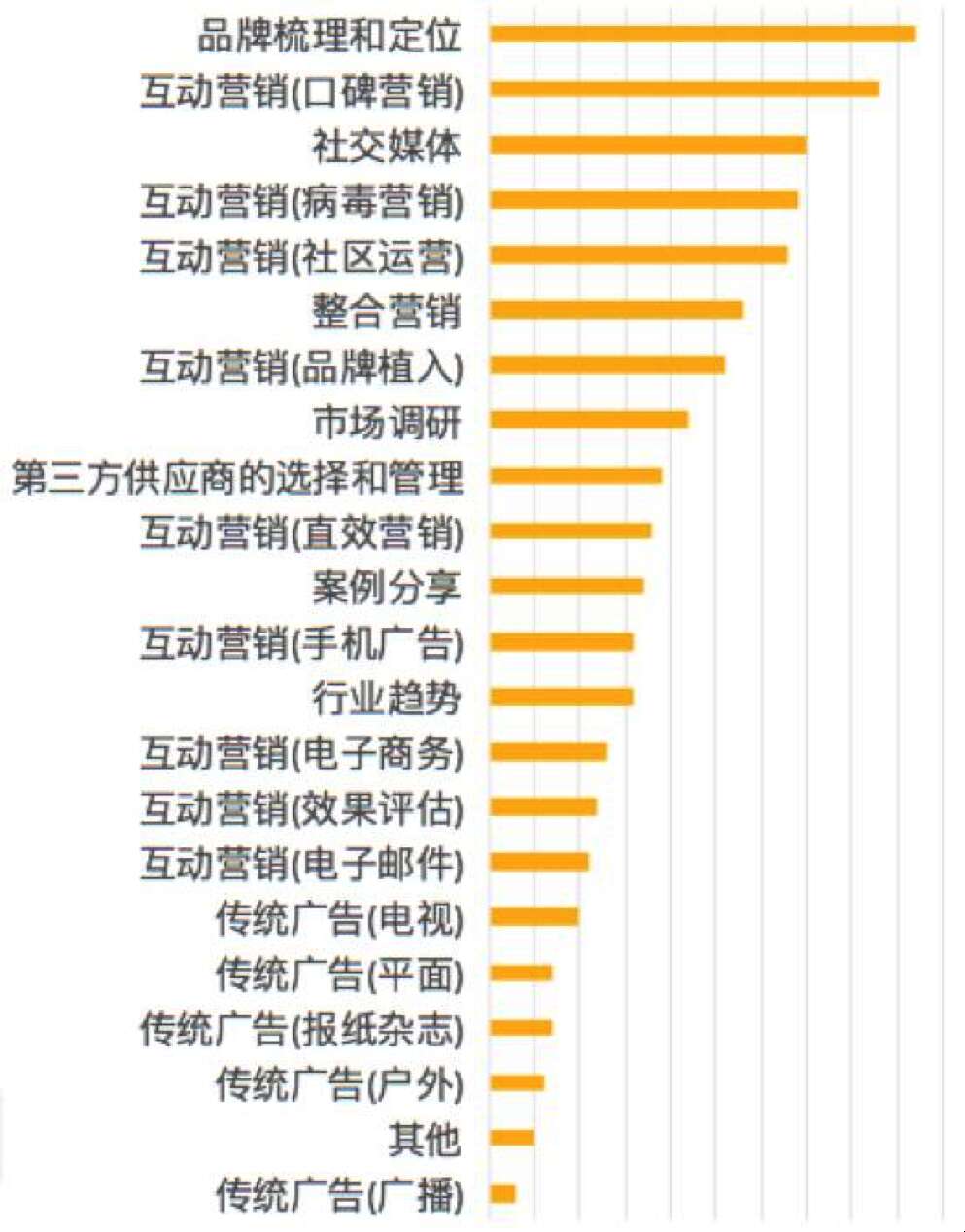 除了互动营销,社交媒体、整合营销、市场调研也存在较大的需求。