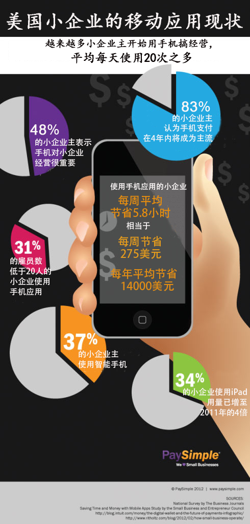 美国小企业的移动应用现状 越来越多的中小企业开始使用移动设备来提高他们的工作效率,中小企业的移动应用商机不可估量 Via://space.yeeyan.org/u/302557 更多阅读:信息图:北美移动开发者赚的钱超过律师等行业New Relic:数据中的移动互联网信息图:手机应用程序的发展IBM:速度和生产效率推动移动商务普及Apptopia:2021年亚马逊在购物应用安装量中排名全球第四移动办公的崛起–数据信息图 Sage:企业为何不为移动技术安排预算信息图:移动内容,使用和期待Big Commerce:移动电子商务会期待电子商务?移动的企业:保持安全性的四部曲信息图:你应了解的移动广告的3点关键信息信息图:消费者如何看待短信营销及短信应用airAD:2012年大气创媒移动广告平台Q4数据报告信息图:短信营销数据解读:移动购物行为–数据信息图