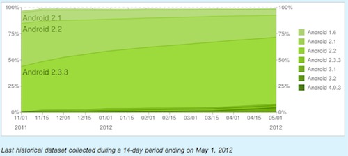 根据 Google 发布的统计,截至 2012 年 5 月初,在所有访问 Google Play 应用市场的设备中,Android 4.0 的份额只有4.9%,而 Android 2.3 依然拥有高达 64.4% 的份额,甚至早已过时的 Android 2.2 所拥有的份额也大大高于 4.0 达到 20.9%。也就是说,虽然从 Android 4.0 发布到现在已经过去了六个月,这个被寄予厚望的新版本却还根本没有壮大起来。这里面存在很多种原因: