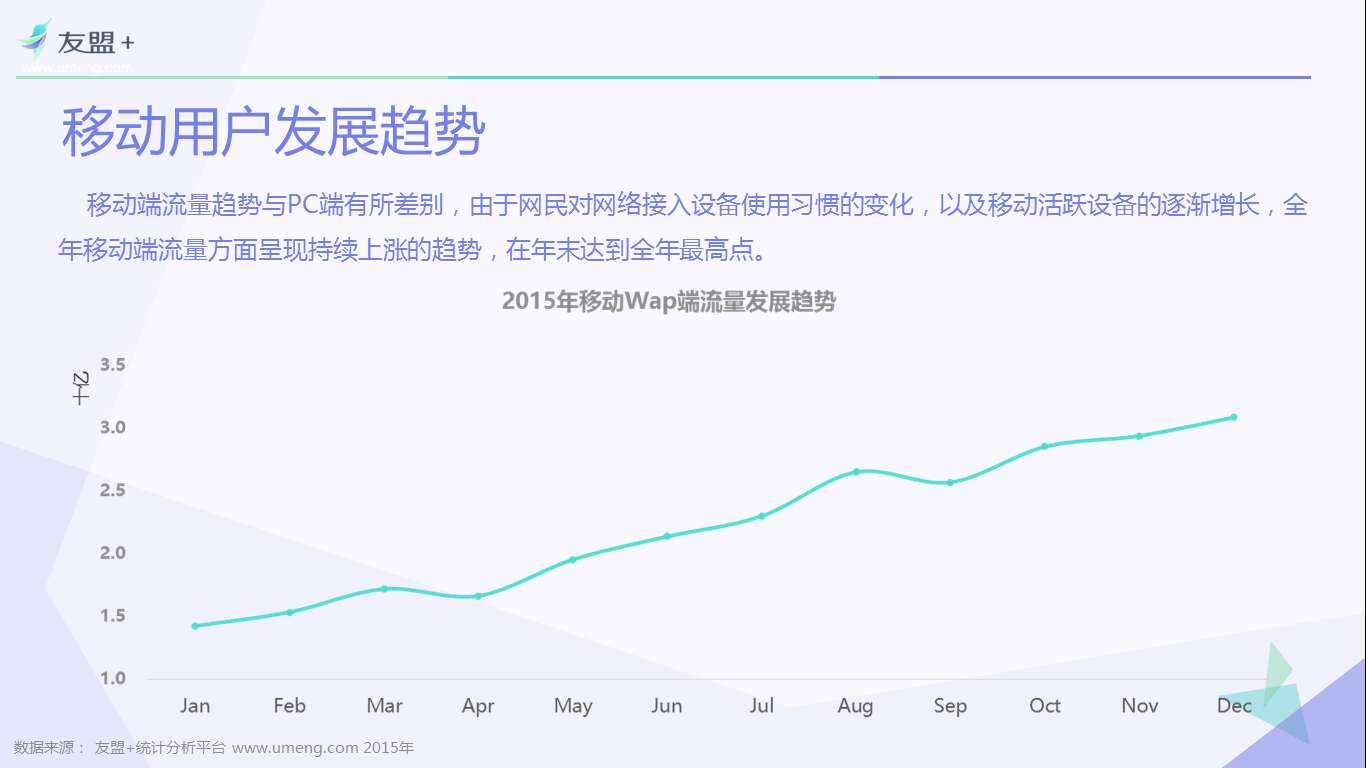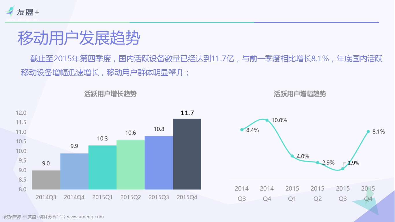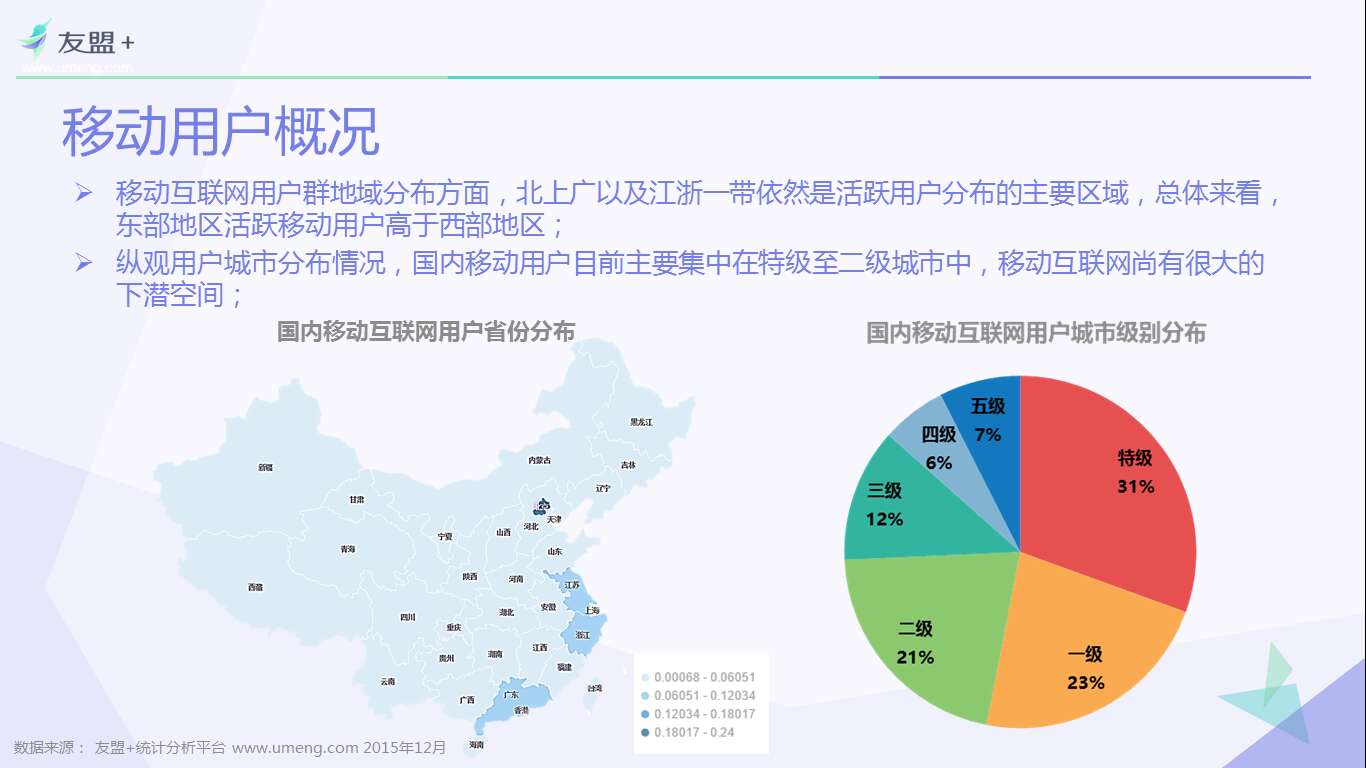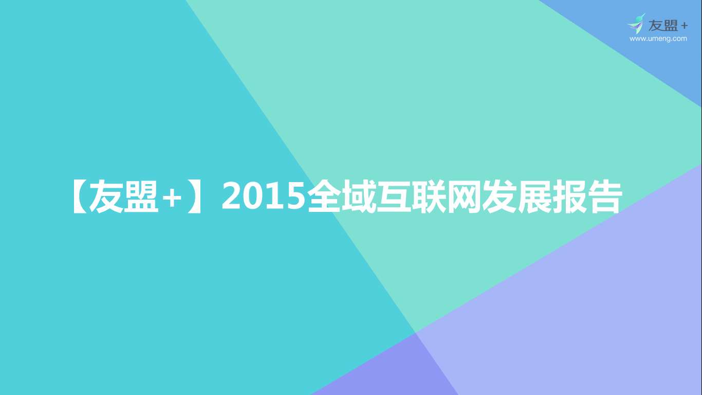 友盟+:2015年全域互联网发展报告 更多阅读:友盟+:2017年全域互联网发展报告友盟+:2016年Q1 O2O移动应用发展报告友盟+:2018上半年移动互联网发展报告“友盟+”猴年春节移动大数据:用户首选棋牌、动作类游戏这家数据公司为什么能成为数百万企业的选择?【友盟+】一周年不忘初心:从整合到融合,从合并到合力友盟+:2015年O2O移动应用趋势盘点(二)—订送餐友盟+:2020年疫期移动互联网行业发展动态分析报告友盟+:2019年Q3移动互联网报告友盟+:2018年1-8月手机行业趋势报告友盟:2015年Q2及Q3中国移动互联网趋势报告友盟:2015年Q1中国移动互联网趋势报告-新型服务在移动端发力友盟指数:一图看尽最新的手机市场格局友盟+ 发布2018世界杯球迷全域数据报告:广州,南宁球迷被大数据授予“最劳模球迷”新零售是什么?从大数据的维度,我们得到一种新答案