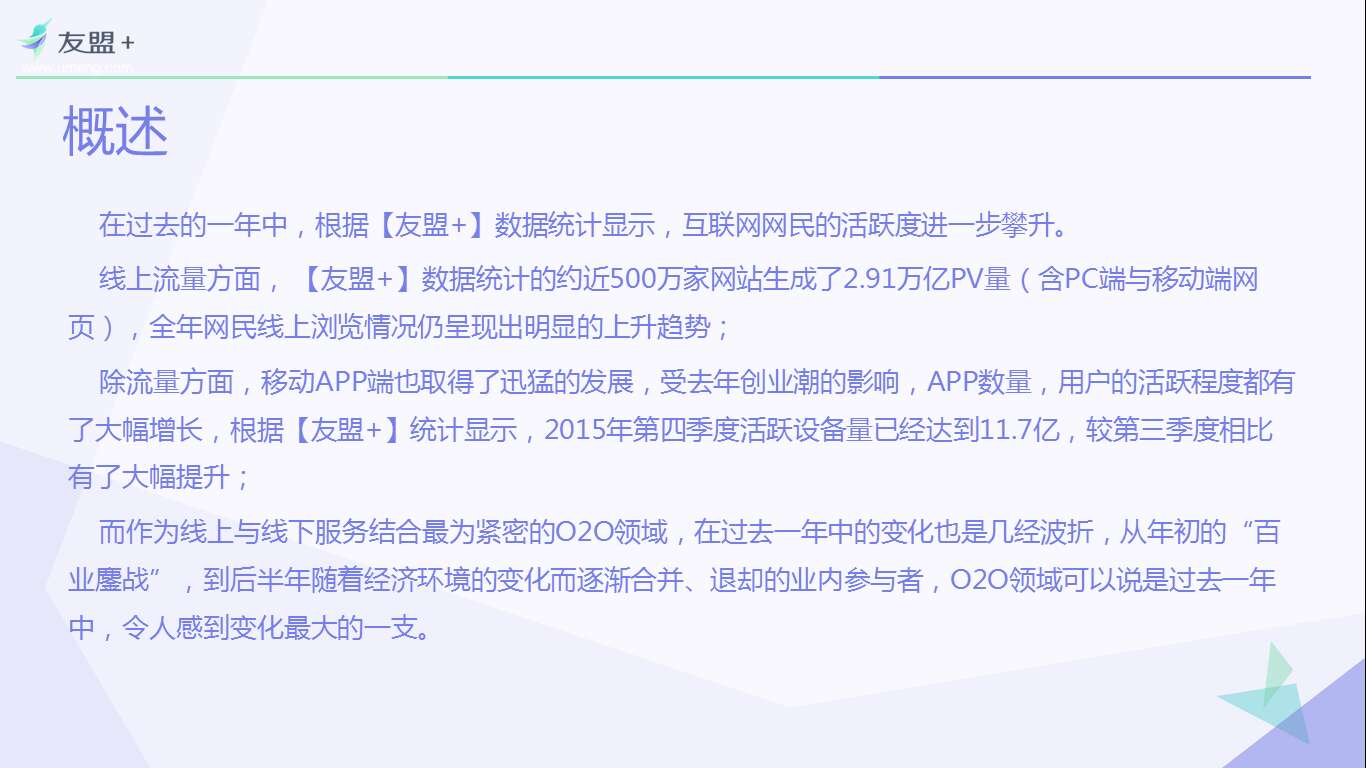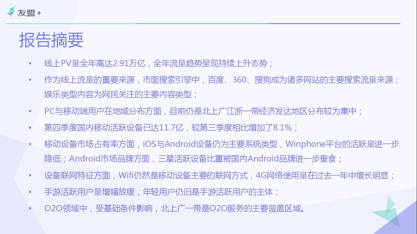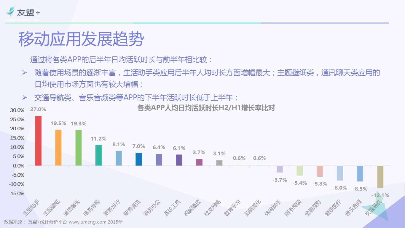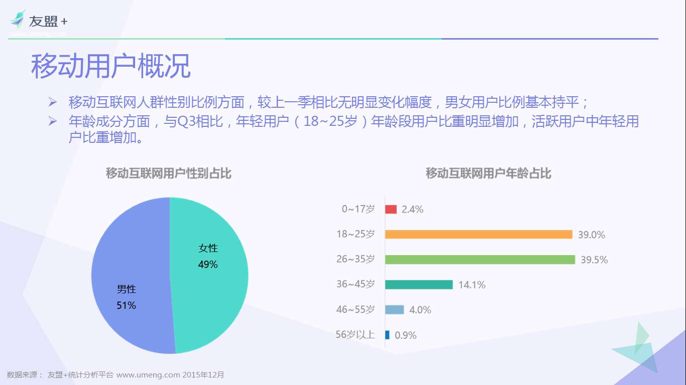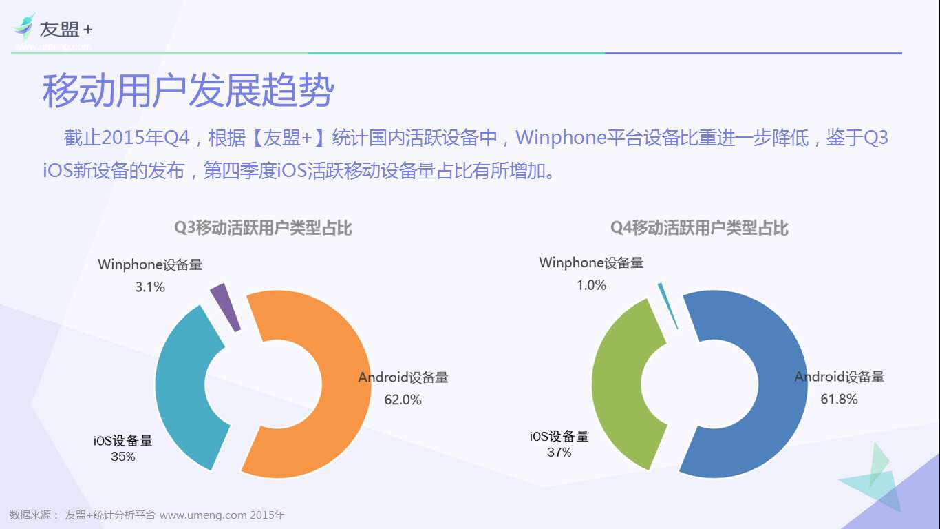 友盟+:2015年全域互联网发展报告 更多阅读:友盟+:2017年全域互联网发展报告友盟+:2016年Q1 O2O移动应用发展报告友盟+:2018上半年移动互联网发展报告“友盟+”猴年春节移动大数据:用户首选棋牌、动作类游戏这家数据公司为什么能成为数百万企业的选择?【友盟+】一周年不忘初心:从整合到融合,从合并到合力友盟+:2015年O2O移动应用趋势盘点(二)—订送餐友盟+:2020年疫期移动互联网行业发展动态分析报告友盟+:2019年Q3移动互联网报告友盟+:2018年1-8月手机行业趋势报告友盟:2015年Q2及Q3中国移动互联网趋势报告友盟:2015年Q1中国移动互联网趋势报告-新型服务在移动端发力友盟指数:一图看尽最新的手机市场格局友盟+ 发布2018世界杯球迷全域数据报告:广州,南宁球迷被大数据授予“最劳模球迷”新零售是什么?从大数据的维度,我们得到一种新答案