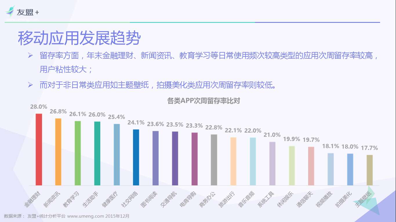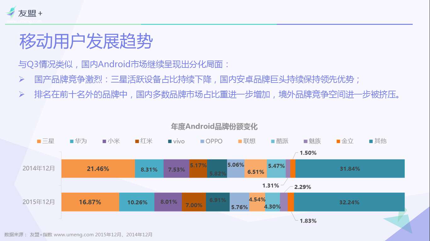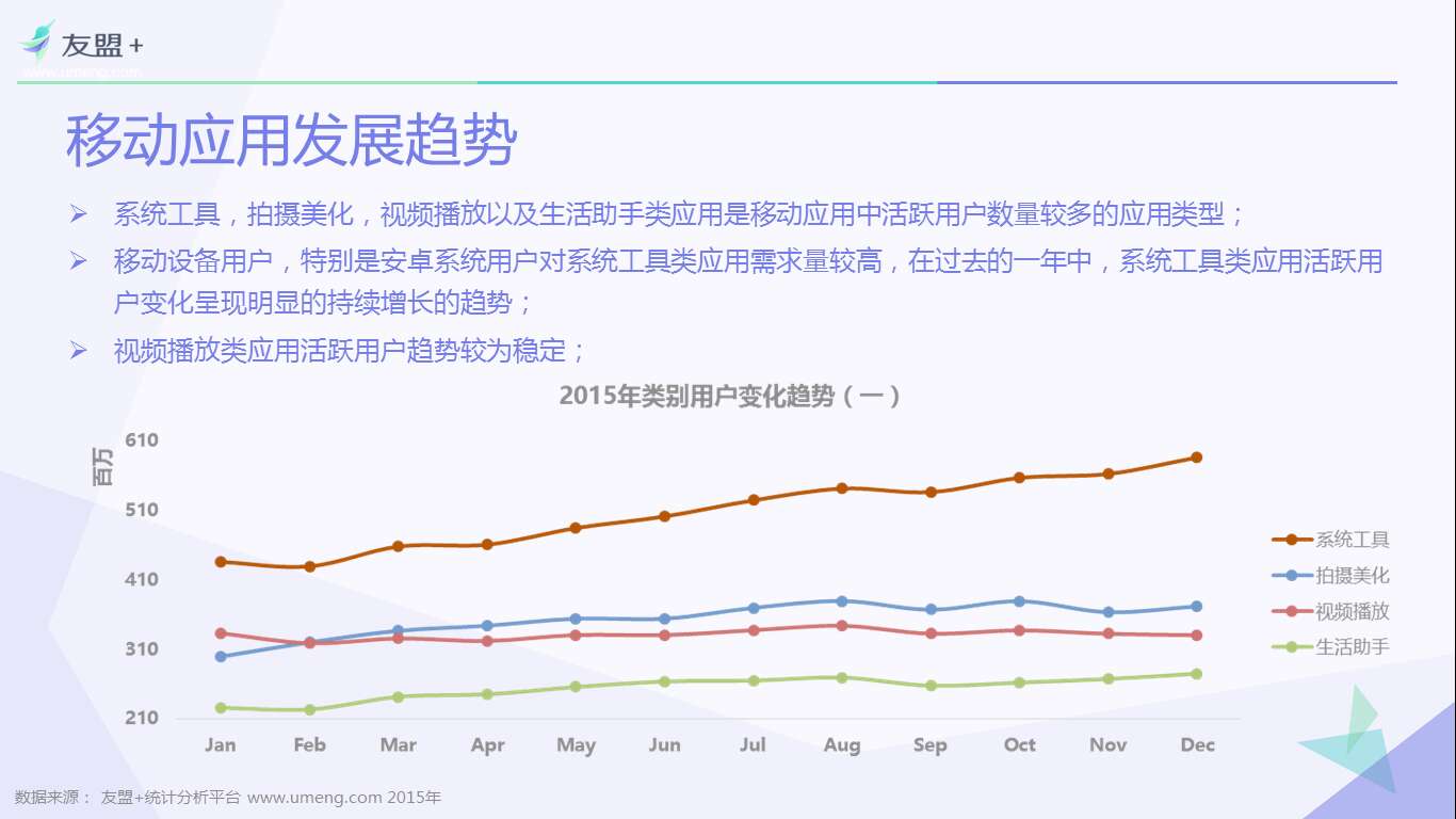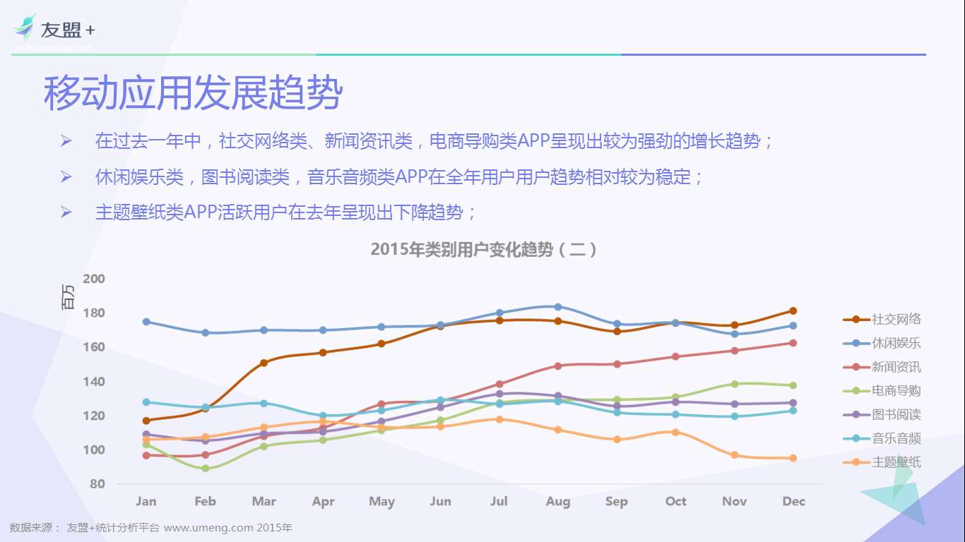 友盟+:2015年全域互联网发展报告 更多阅读:友盟+:2017年全域互联网发展报告友盟+:2016年Q1 O2O移动应用发展报告友盟+:2018上半年移动互联网发展报告“友盟+”猴年春节移动大数据:用户首选棋牌、动作类游戏这家数据公司为什么能成为数百万企业的选择?【友盟+】一周年不忘初心:从整合到融合,从合并到合力友盟+:2015年O2O移动应用趋势盘点(二)—订送餐友盟+:2020年疫期移动互联网行业发展动态分析报告友盟+:2019年Q3移动互联网报告友盟+:2018年1-8月手机行业趋势报告友盟:2015年Q2及Q3中国移动互联网趋势报告友盟:2015年Q1中国移动互联网趋势报告-新型服务在移动端发力友盟指数:一图看尽最新的手机市场格局友盟+ 发布2018世界杯球迷全域数据报告:广州,南宁球迷被大数据授予“最劳模球迷”新零售是什么?从大数据的维度,我们得到一种新答案