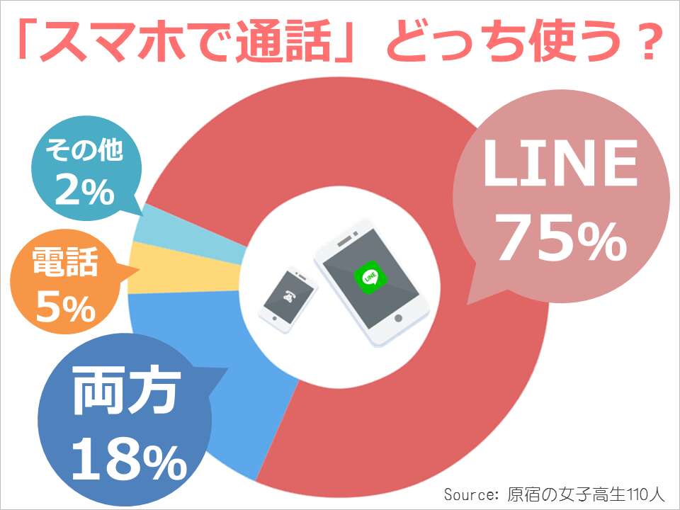 接下来我们着重来看LINE的使用情况,大概75%的日本女子高中生只使用LINE来打电话,而只使用电话功能进行通信的只占到5%。可以说LINE已经成为了日本学生党必不可少的工具了。