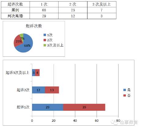 北京市昌平区离婚案件调查报告 追求幸福、美满的婚姻是每个走向结婚殿堂的人的美好愿望,但现实的状况令人担忧。 回溯中国古代,婚姻被传统大家庭的家长们牢牢操持;再看当下,改革开放后中国经济飞速发展,人们的思想观念也随之发生巨大变化,传统婚姻观念土崩瓦解,“闪婚、裸婚”等现象比比皆是,“婚外情、闪离、家庭不和”等婚姻问题层出不穷。 根据民政部发布的数据显示,自2004年以来,我国离婚率连续10年递增;2012年全国共有310余万对夫妻办理离婚手续,离婚率增幅首次超过结婚率增幅,2013年攀升到350万对,比上年增长12.8%。 就北京市而言,2011年,3.2万对;2012年,3.8万对;2013年,5.4万对……近年来,北京市的离婚人数逐年攀升,2013年同比增长42.6%。这意味着在北京每天有近150对夫妻协议离婚、家庭解体。 婚姻问题关系到我们每一个家庭的和睦,由此而产生的社会问题也是当下备受关注的热点。法院受理的婚姻案件数量年年攀高,怎样做出公正合理的判决,如何解决离婚后各种纠纷也成了法院审理的重点、难点。 因此,我们研习小组随机选取100份裁判文书对北京市昌平区2015年法院所受理的离婚案件进行了抽样调查分析,并对婚姻中所出现的问题做了一定的思考,提出了一些自己的看法,意在为大众提供关于如何应对婚姻纠纷的参考。当然,我们的方法和技术还不成熟,难免会出现疏漏和误差,希望各位能够提出宝贵意见,批评指正。 一、昌平区离婚纠纷现状 (一)离婚时结婚时长集中在7-10年,婚龄20年以上的离婚率也很高 由数据分析可知,昌平区2015年100对离婚夫妻中,离婚时婚龄从1年到10年不断走高,然后回落,到20年之后再度上升。峰值出现在7-10年(占28%),而婚龄20年以上离婚的夫妻也较多(占13%)。 (二)提出离婚的多为女方 被选取的昌平区各人民法院2015年受理的100起离婚案件中,由男方提出离婚的有42起,低于女方提出的58起。 (三) 判决不予离婚的比例更高 100件被选案例中,最终被判决离婚的有44例,而判决不予离婚的数量有56例,高于判离的数量。 (四)离婚原因以感情不和、性格不合、家庭暴力为主 纵观百起离婚案件,当事人双方离婚的原因依然以感情不和、性格不合、家庭暴力为主。离婚的原因多样,具体比例为:家庭暴力22%,情感不和30%,生活琐事14%,婚外情2%,分居8%,性格不合12%,经济纠纷4%,其他8%。其中,其他原因包括疾病、犯罪、婆媳矛盾、无夫妻生活等。 (五)离婚纠纷中涉及子女抚养的案件较少,此类案件中子女归女方抚养情况较多 在我们选取的100起纠纷中,涉及子女抚养问题的有24起,而在此类案件中,子女归男方抚养的有9起(占37%),归女方抚养的有15起(占63%)。 (六)涉及房产分割的案例中,房产多数分给了男方而女方获得经济补偿 在12起涉及房产分割的案例中,房产判给男方的有7起(占58%),判给女方的有3起(占25%),判决双方均分的有2起(占17%)。 (七)离婚案件中二次、三次起诉的较少,起诉次数对判决离婚与否影响不大 在100起离婚纠纷中,一次起诉的有68起,二次起诉的有25起,三次起诉的有7起。而不管起诉次数如何变化,判决离婚的比例都维持在略低于百分之五十的水平。 二、关于离婚案例分析的思考 (一)不同婚龄阶段离婚案件数量走势带来的思考 根据前文数据我们知道,离婚案件数量从婚龄1年到婚龄10年不断走高,然后回落,到婚龄20年之后再度上升,其中的原因众多。 先看结婚1-10年的夫妇。首先,这个阶段的夫妇仍属于年轻夫妻,年轻夫妻受传统观念束缚不深,可能没有孩子,无须考虑担心家庭对子女身心健康成长的重要性,且事业刚刚起步,离婚成本小。其次,现代社会人口流动频繁,许多年轻夫妻来自不同地域、不同成长环境,生活习惯、价值观等(例如“凤凰男”)存在很大差异,容易造成矛盾。 再看婚龄十年以后离婚案件数量回落。我们认为原因有以下几点:第一,随着夫妻双方矛盾的愈演愈烈,婚姻也会面临一个转折点。经历一次危机性的考验。而一旦成功渡过“七年之痒”,感情能朝向良性健康的方向发展。第二,随着时间的增长,虽然矛盾会增多,但感情也会也深厚,曾经的爱情转化为亲情,夫妻生活会变成一种习惯。也会对婚姻和彼此产生更多的留恋和依恋。第三,随着时间的推移,少了一点意气风发和冲动,多了些理性。以成熟的眼光看待婚姻和生活中的矛盾,平静地寻求解决方案。第四,儿女因素。考虑到孩子较小,为了让孩子健康,快乐成长,双方会尽力尝试挽回婚姻。 最后是婚龄20年左右的夫妇离婚比例上升。这是近年来的一个新情况,更有学者提出,这个阶段的夫妇离婚率很快将有可能会超过年轻夫妻。我们案情思考后得出了几个可能的原因:首先,这个年龄段的人处在社会转型时期,他们经受了离婚观念巨大转变的过程。虽然这部分人大都有子女,但是仍然将追求幸福生活放在了首位,一旦双方感情出现无法弥补的裂痕,就渴望自由而给自己一个重新选择的机会。其次,不同于初出茅庐的年轻人和事业上升期的人,中年人正处在事业的黄金时期,面对的诱惑之多是前所未有的。在我们调查的昌平区100起离婚诉讼案件之中,婚外情、分居原因占据了26%。而上海社科院社会学研究所徐安琪研究员对500位离婚当事人的调查结果显示,主要的离婚原因为一方或双方有婚外恋的占40%以上。 归根结底,出现这些情况的原因无非还是人们的婚姻观念发