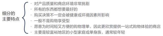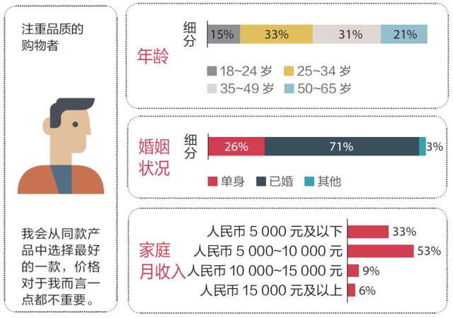 那么,追求品质的消费者是怎样的群体,他们有哪些特点?尼尔森发布的《2015消费者购物趋势报告》显示,注重品质的消费人群有着一定的收入基础和较好的经济条件,这使得他们能够从容淡定的消费;除此之外,他们通常更加年轻且受教育程度较高,且大多是来自较富裕地区的小型家庭或者年轻的单身族。与此同时,还有一种尤为注重健康的消费群体,他们在生活态度和主要购物诉求等特征上与品质人群较为接近。