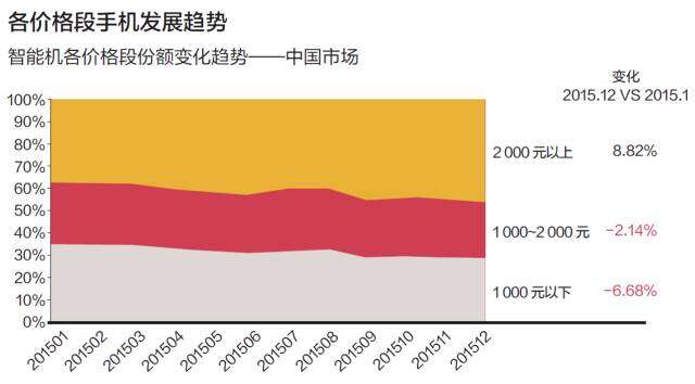 除了快消品,耐消品行业在中国也有品质型消费的趋势。以电子产品为例,2015年居民消费中交通通讯类产品消费增长超过13%。据尼尔森智能设备份额监测平台数据显示,中国智能手机市场正在由增量时代步入存量替换时代,这意味着消费者不再是第一次购买智能手机,而是为了更新换代现有的智能机从而获取更好的用户体验。去年,中高端智能手机(2000元以上机型)的整体份额从36.9%增至45.7%,增长近9%;而1000元以下机型的整体份额下降最为明显,降幅超过6%。预计2016年中高端智能手机产品的份额将进一步加大。