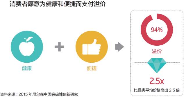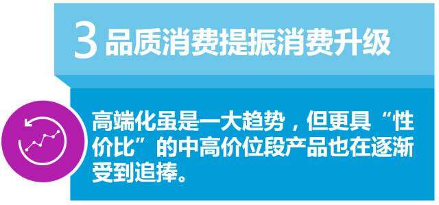 不难看出,在中国市场,无论是是快消品还是耐消品行业都在经历剧烈的消费转型。毫无疑问,追求品质生活提高选择产品质量对拉动消费起到了至关重要的作用,也使得当今的消费者更加理性成熟,厂商更加注重产品品质。在产品质量的把控上,厂商、消费者都会更多地关注产地(如奶粉中的澳洲原装进口)、原料(如即饮咖啡中的哥伦比亚咖啡豆)等。消费者的判断更加理性,不再盲目追求高价,而是选择更为适合自己的产品。高端化虽是一大趋势,但更具“性价比”的中高价位段产品,比如更适合国人的日韩护肤产品和更适合中国婴幼儿的配方奶粉也在逐渐受到追捧。于此同时,由于对购买产品的精神诉求大幅提升,因此产品的内涵、情怀也成为彰显消费者生活品质的一大卖点,中国味道、城市记忆、国货等也成为宣传差异化品质的立足点。