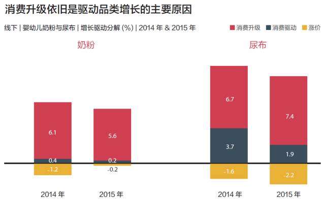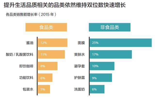 在尼尔森监测的快速消费品中,大部分成熟品类均有消费升级发生,而且在近几年持续发酵。2016年,中国的快速消费品市场销售增长将略快于2015年,消费升级的趋势继续延续。