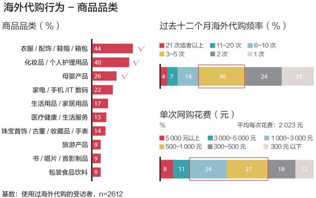 高收入高学历的年轻人构成了跨境网购的主力军,他们主要是在26~35岁的年轻男性以及26~40岁之间的女性。相比国内网购,偏爱跨境网购的人更多在独资、合资或外资工作,教育程度普遍较高,多数家庭月收入超过11000元。相比较传统网购,跨境网购呈现“频次略低”但“客单价更高”的特点。三成跨境网购购物者在过去一年的购买频率达3~5次,频次为国内网购的76%。然而,跨境网购达到国内网购客单价的176%。其中约四分之一的受访者跨境网购单次花费在1000~3000元,11%消费者单次花费在5000元以上。