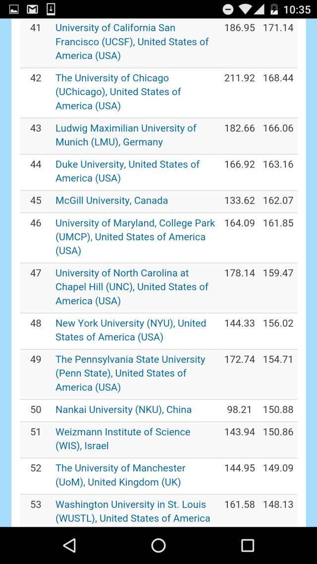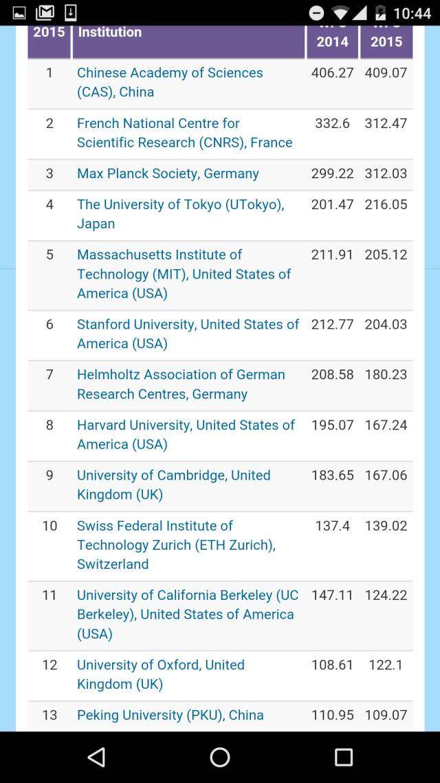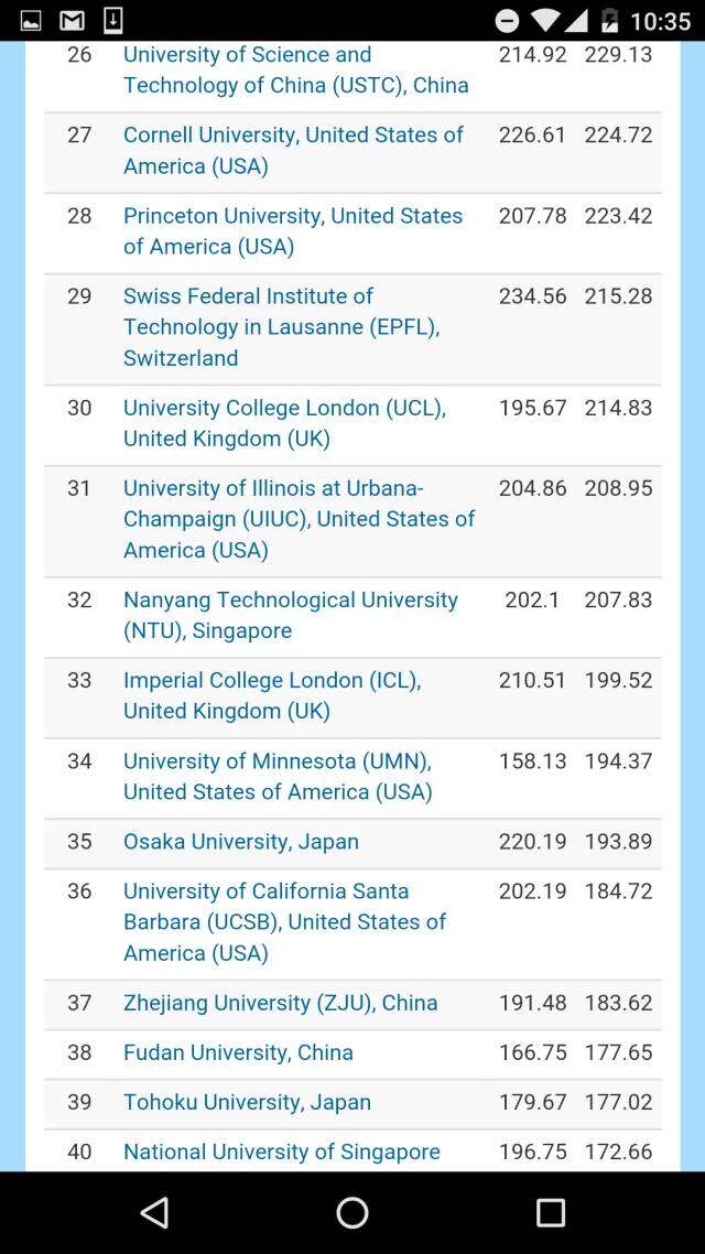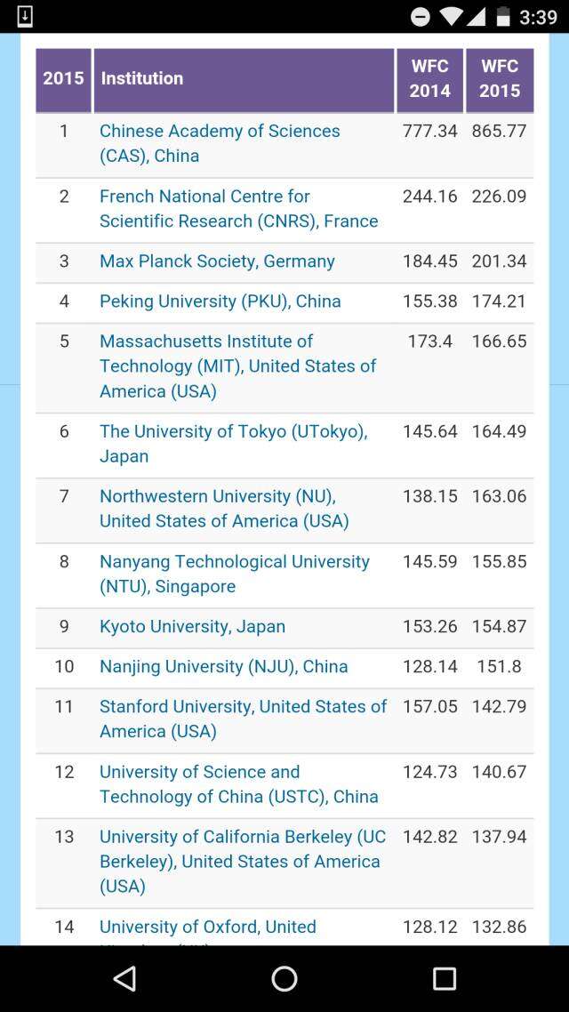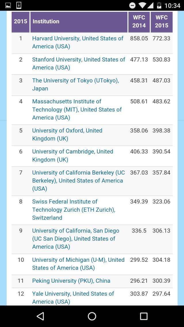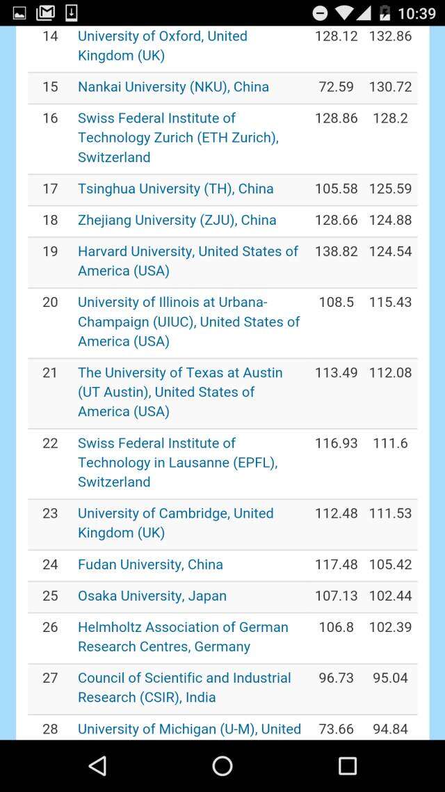 在去掉各个国家科学院系统的全球大学排名之中,哈佛大学高居榜首、斯坦福大学排名第二,日本东京大学挤进前三,麻省理工学院和牛津大学分别排在第四和第五。前十名中还有瑞士理工。而中国的北大则压倒耶鲁排名第11,领跑第二梯队。进入全球50强大中国高校,还有南京大学、清华、中国科大,浙大、复旦、和南开。