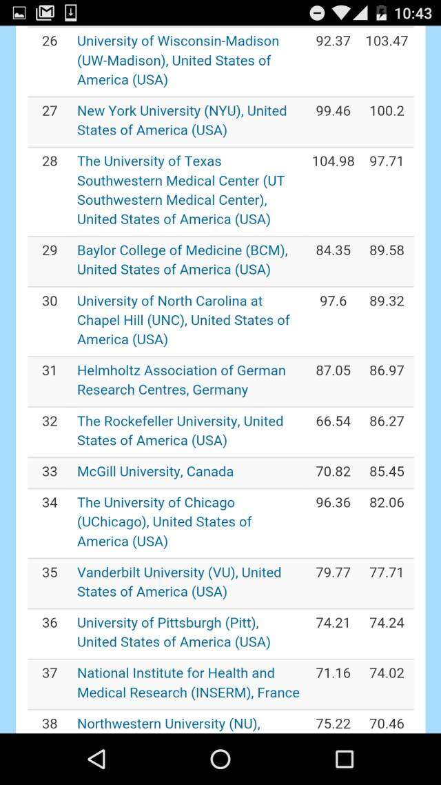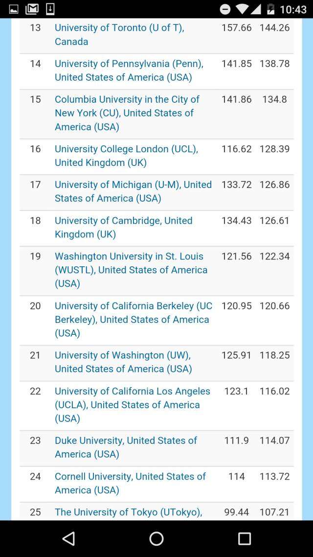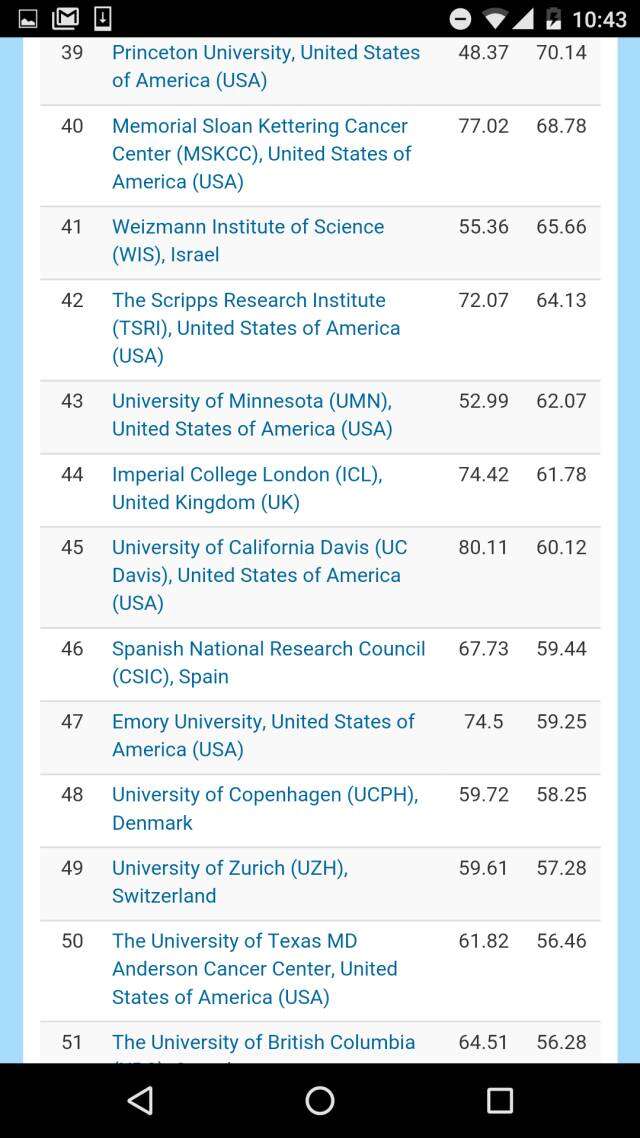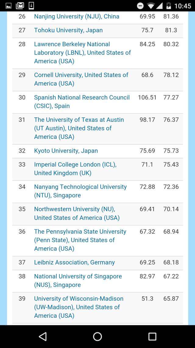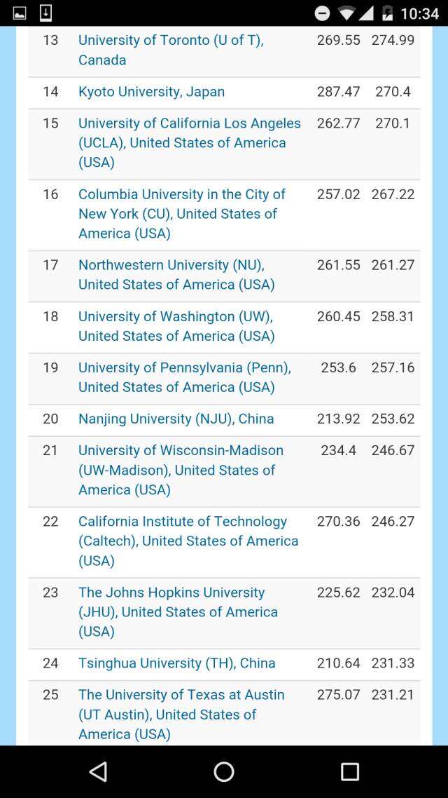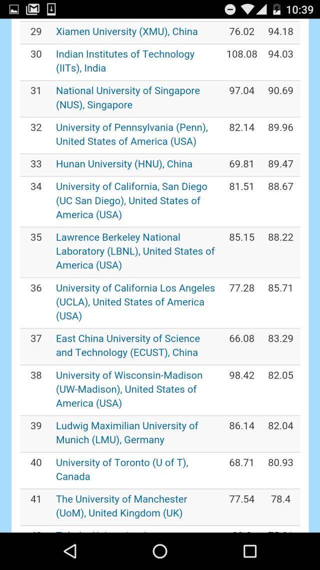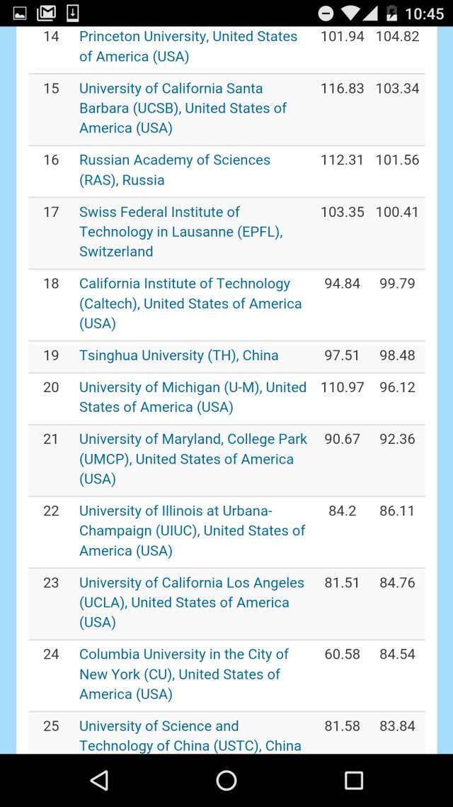 在去掉各个国家科学院系统的全球大学排名之中,哈佛大学高居榜首、斯坦福大学排名第二,日本东京大学挤进前三,麻省理工学院和牛津大学分别排在第四和第五。前十名中还有瑞士理工。而中国的北大则压倒耶鲁排名第11,领跑第二梯队。进入全球50强大中国高校,还有南京大学、清华、中国科大,浙大、复旦、和南开。
