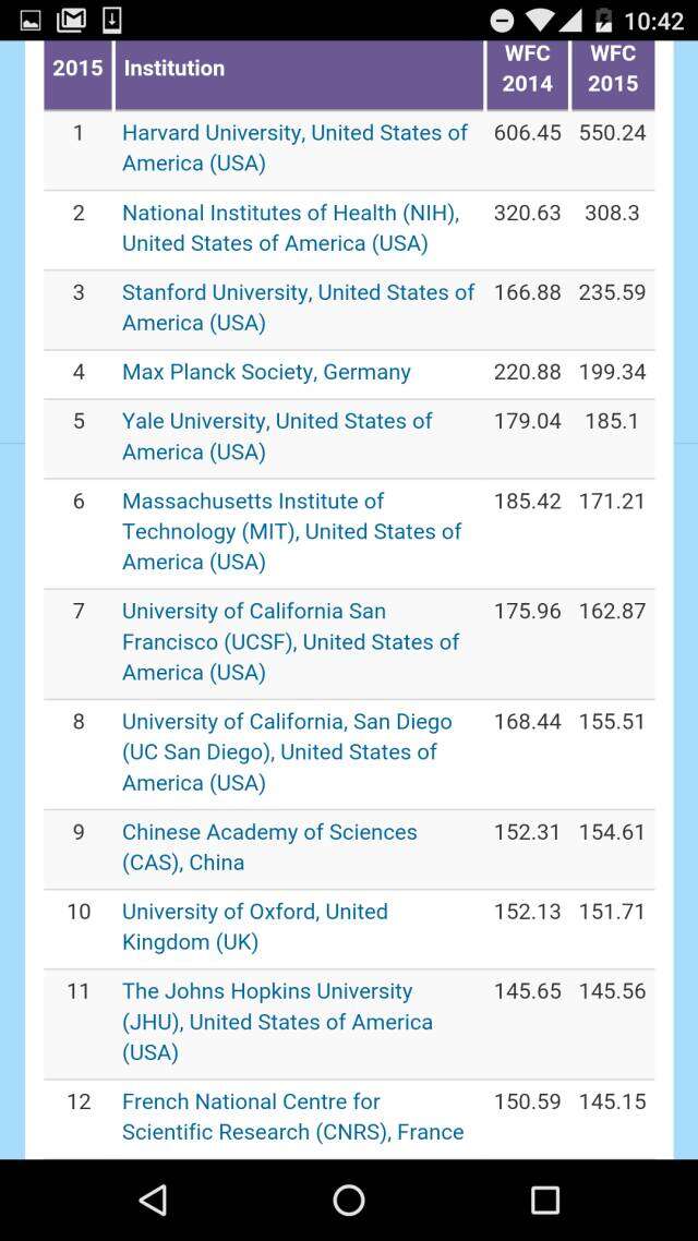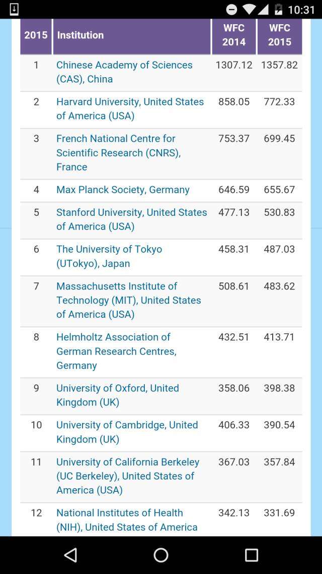在综合性的全球科研机构排名中,中国科学院高居榜首,得分几乎是排名第二的哈佛大学的两倍。而且从下面的表格可以看出,年度纵向比较,中科院有小幅度增长,而哈佛却略有下降,两者差距在持续增大。此外,法国和德国的国家研究院分列三、四名,而斯坦福大学则排在第五。