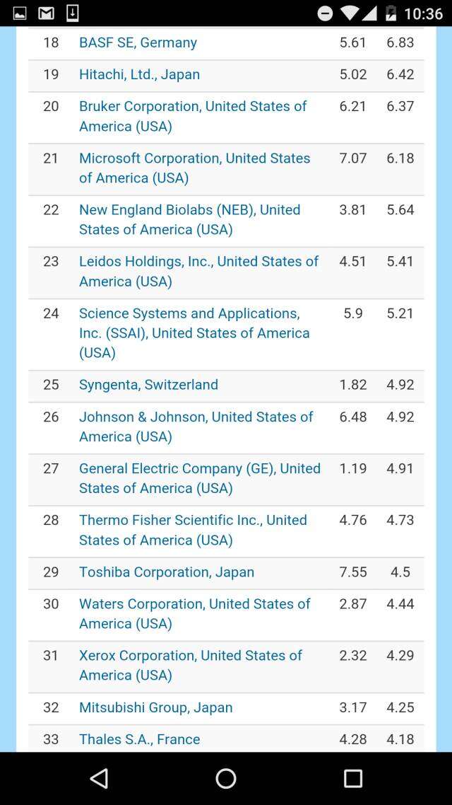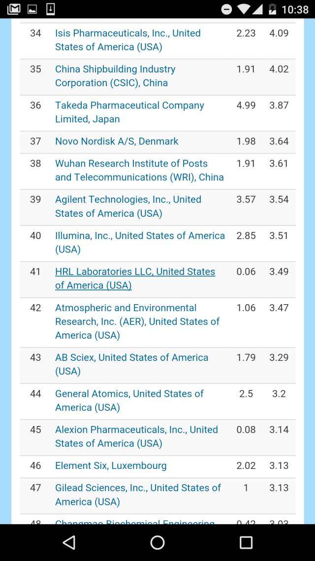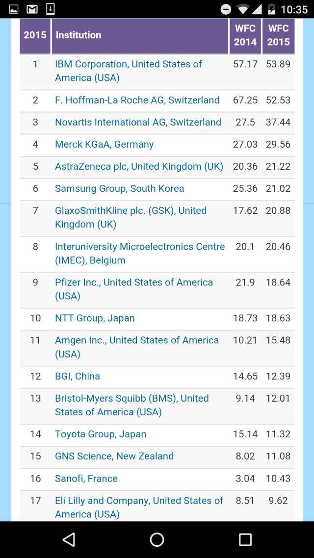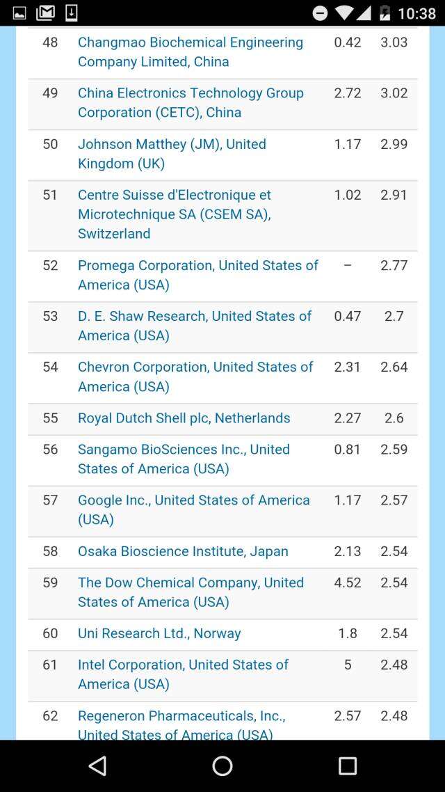 在体现各国工业水平的全球产业机构排名中,美国IBM高居榜首,两家瑞士公司分别榜眼和探花。韩国的三星名列第六,表现抢眼。而华大基因则不出所料的引领中国公司,排在第12。上榜的中国机构还有中国船舶、武汉邮电研究院、常茂生物化学工程公司、中国电子、中国航天、药明康德、和金川集团。