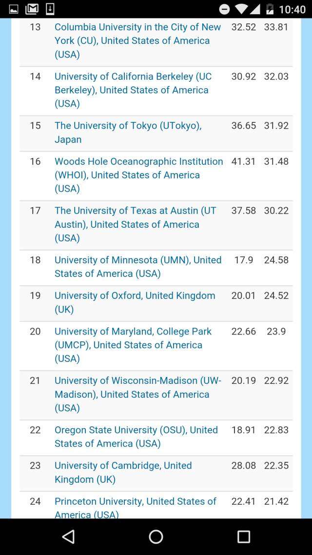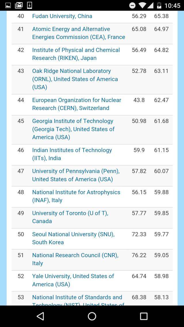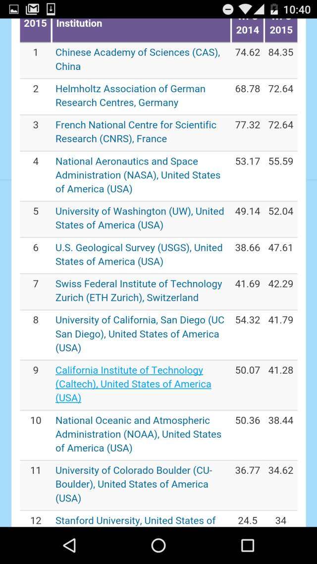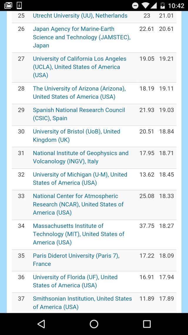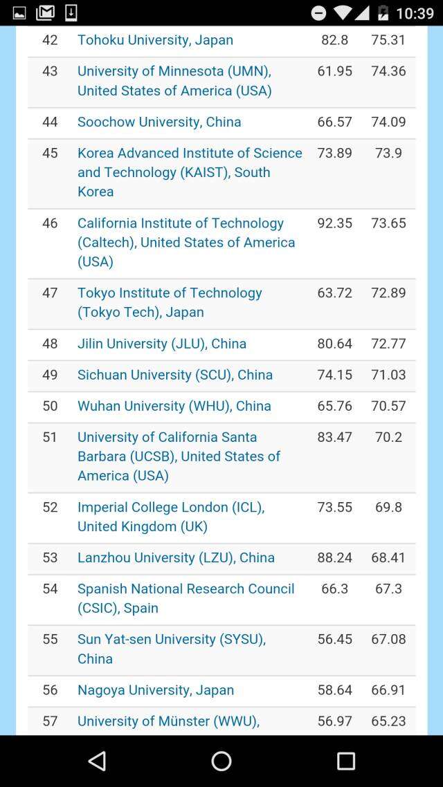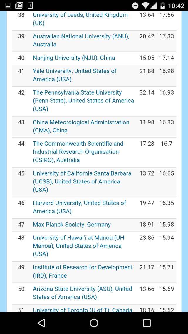 与化学比,中国地球与环境科学相对薄弱。除中科院第一之外,排名最高的是第40南京大学、第43中国气象局。上榜的中国机构还有南京信息工程大学、中国地震局、中国地质大学、国家海洋局、和中国科大。