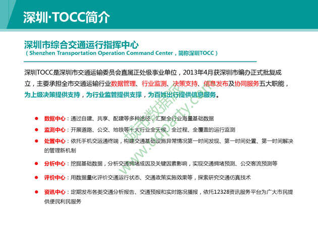 大数据分析在智能交通中的探索与实践(PPT) 更多阅读:大数据应用于智能交通产业发展规模分析从萧山警匪案看大数据分析预测能力如何创造价值点球成金——运动中的大数据分析如何使大数据分析的价值最大化大数据分析的几个极佳用例如何削减大数据分析的成本大数据分析中的基本评价指标大数据分析:年轻用户增速缓慢 大众廉价车如何吸引90后?大数据分析美国音乐排行榜50年的演化史八大趋势看透大数据分析的未来日本零售O2O七大模式分析 大数据分析是未来的关键数据的局限:大数据分析不能告诉你什么大数据分析的价值和意义:直抵事实的真相对大数据分析有哪些流行误解?2014年大数据分析趋势展望